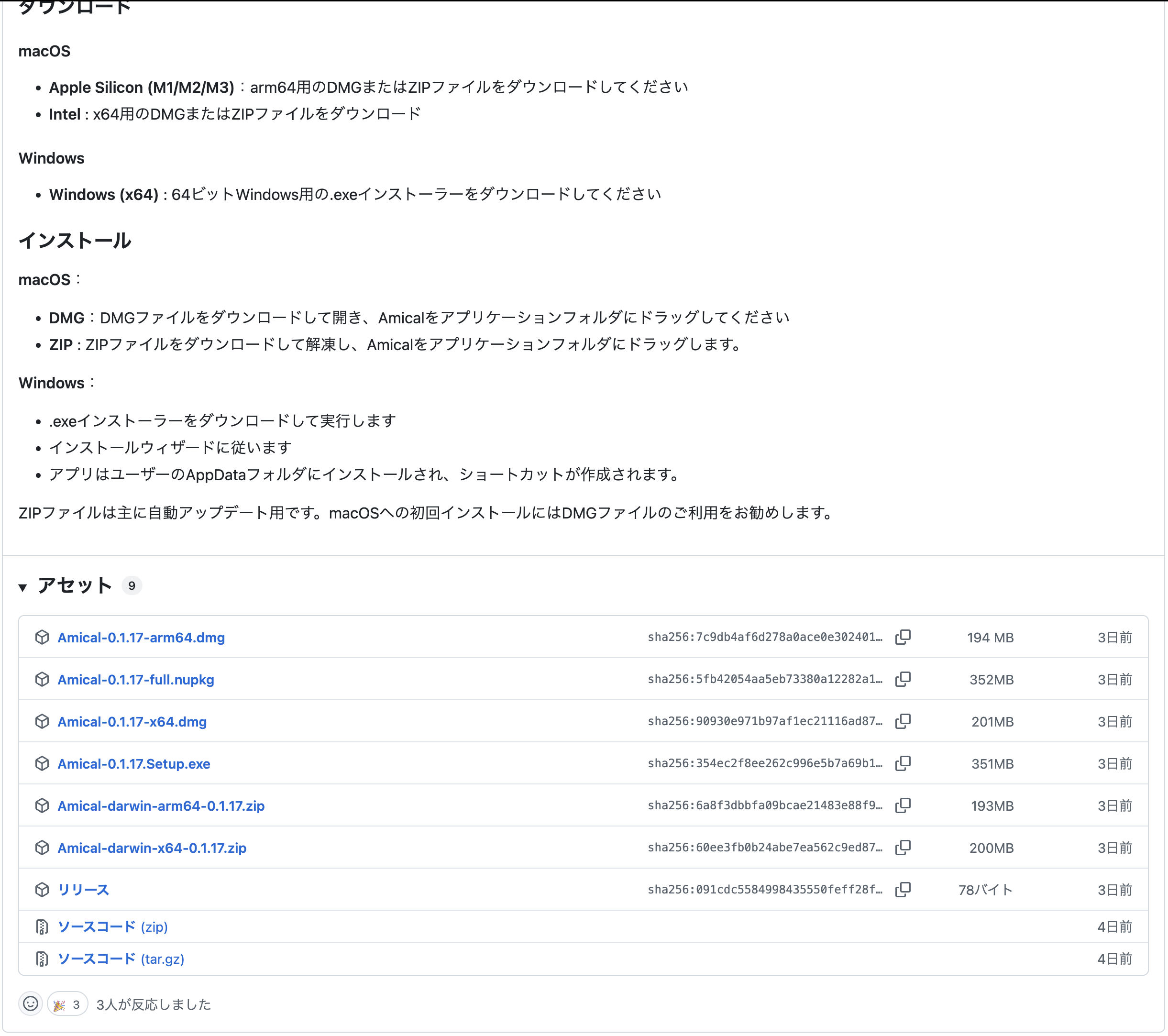 - Amical Releases(配布): https://github.com/amicalhq/amical/releases