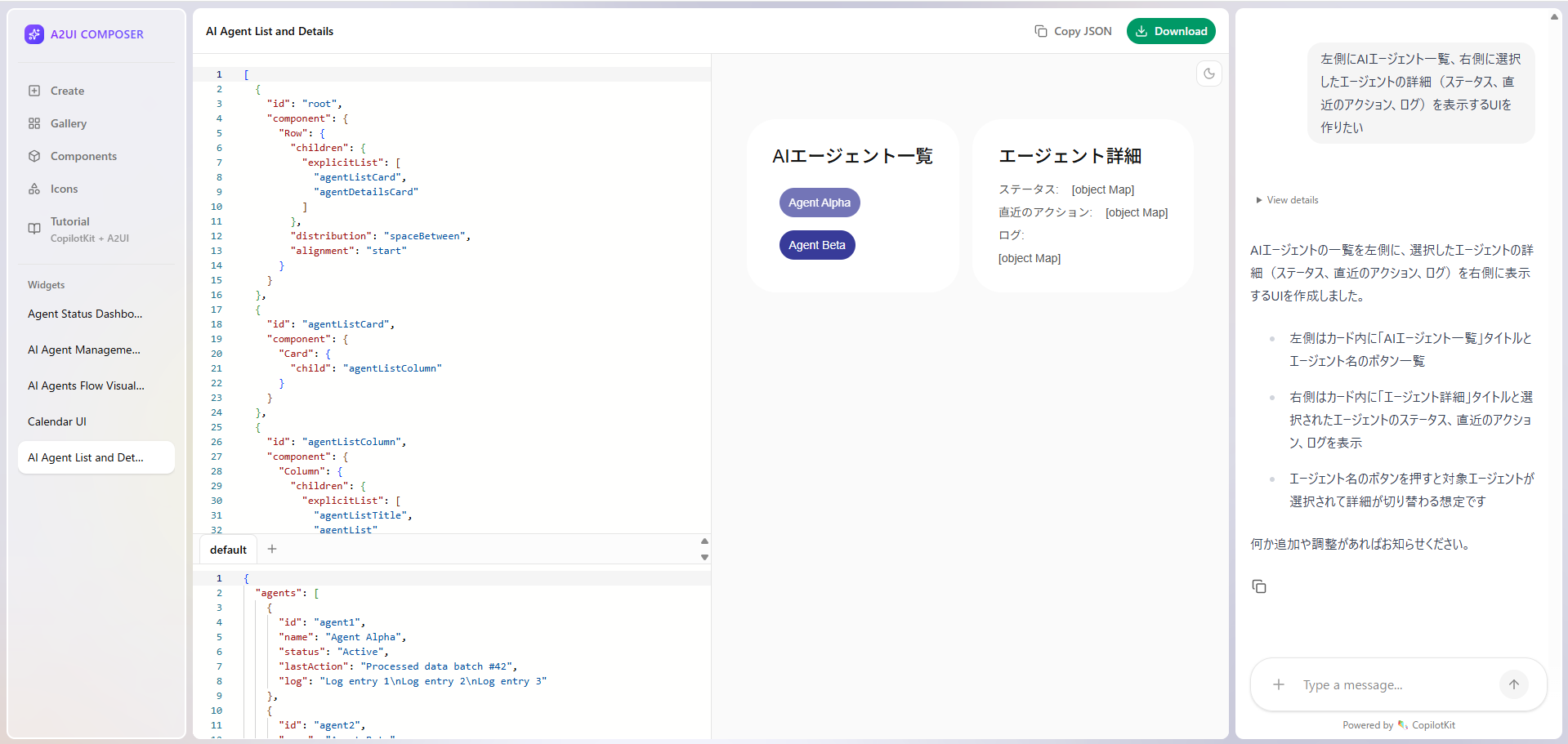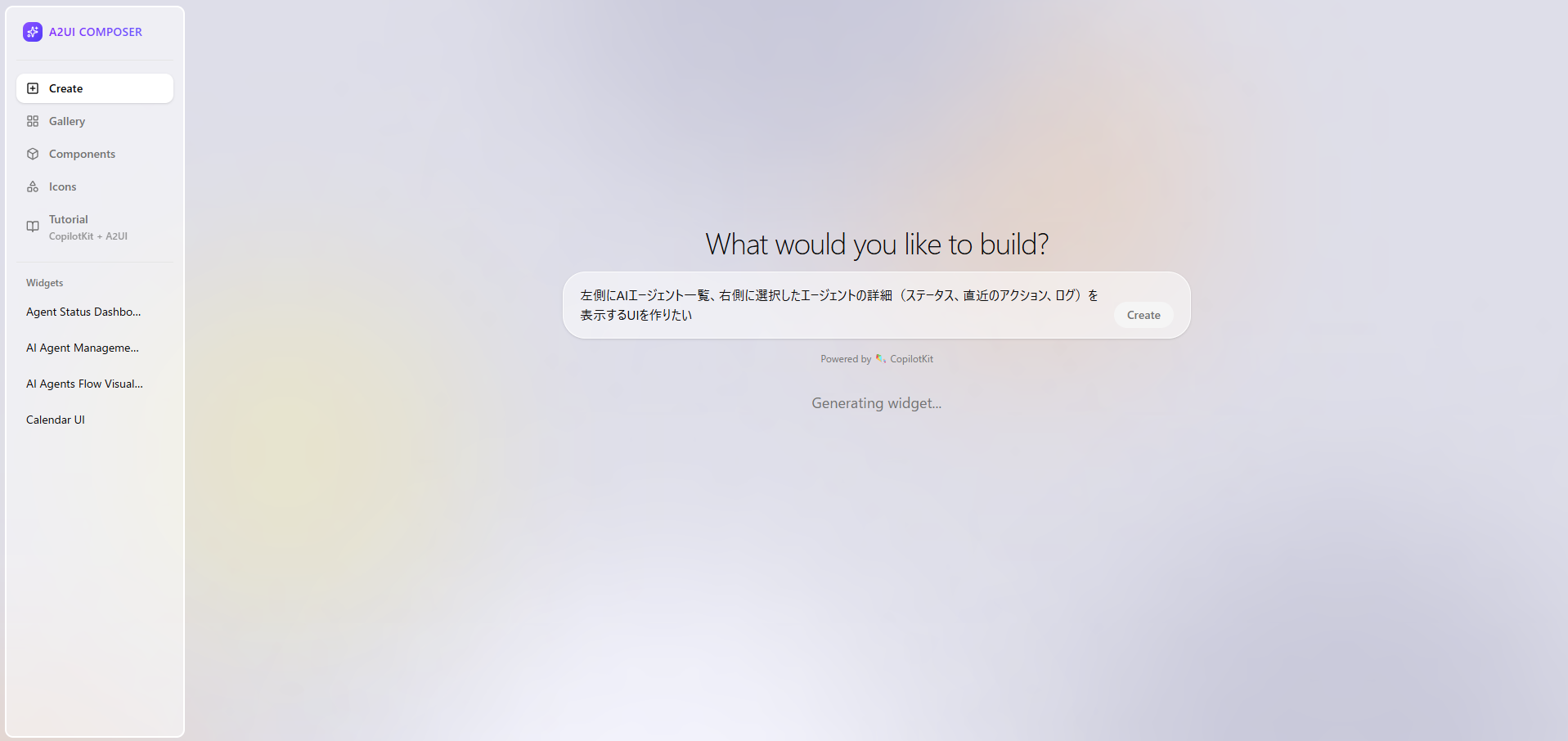次の記事では具体的な使いかたやA2UI Composer(CopilotKit)の紹介もしてます。