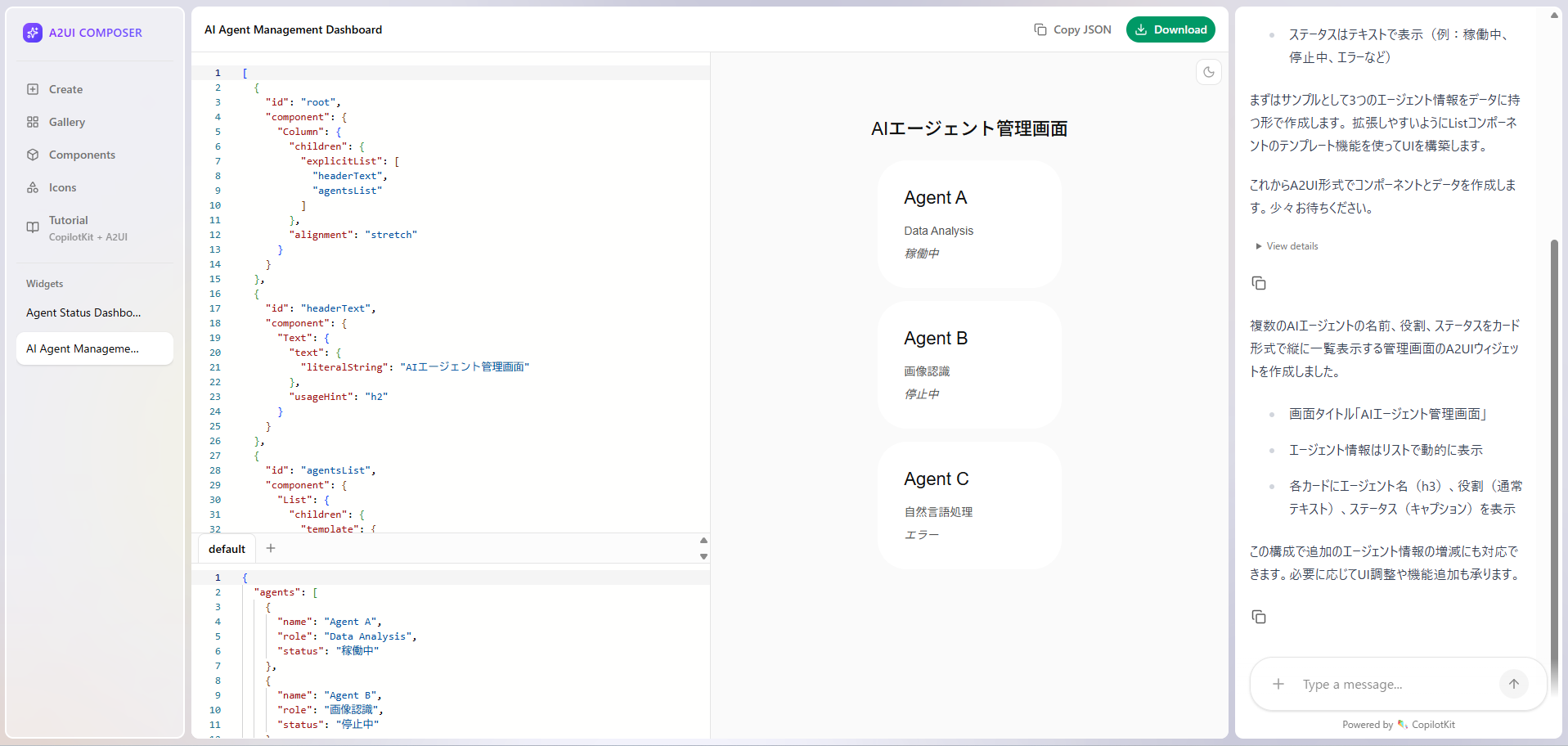 テキストだけでなく、構造化された UI を JSON で表現し、エージェントからクライアントへ送信してレンダリングします。これにより、AI と人間のインタラクションが自然になります。